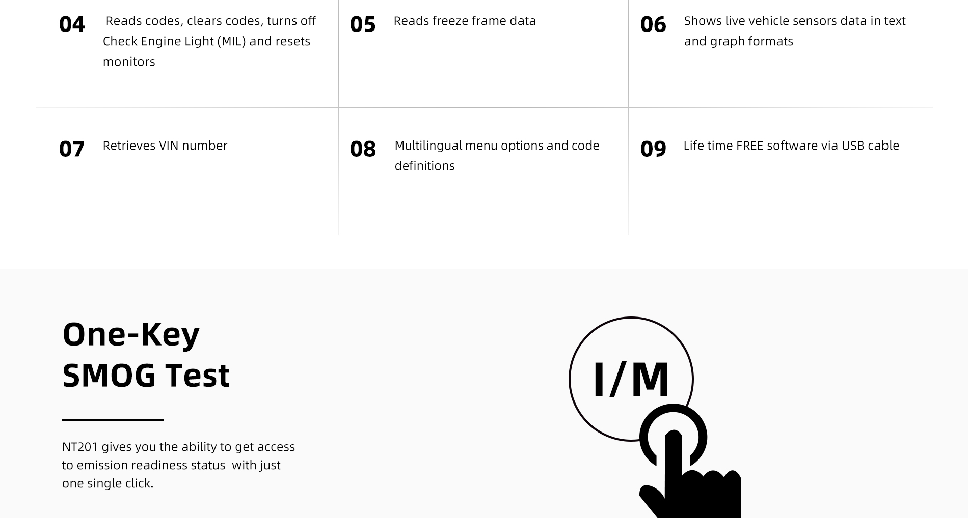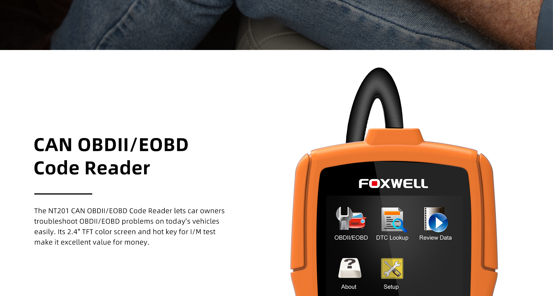 The NT201 CAN OBDII/EOBD Code Reader lets car owners troubleshoot OBDII/EOBD problems on today's vehicles easily. Its 2.4" TFT color screen and hot key for I/M test make it excellent value for money.